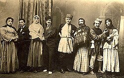 1917-ci ildə Aşqabad Azərbaycan teatrında "Arşın mal alan" spektaklının iştirakçıları: (sağdan sola) Telli (Yəhya İsmayılov), Vəli (Mirzə Səmədov), Cahan xala (Aslan Hacıyev), Sultanbəy (Əziz Cavadov), Əsgər (Əli Məmmədov), Gülçöhrə (Ağaqulu Abdullayev), Süleyman (Rzaqulu Abdullazadə), Asya (Rəhim Rəhimov)