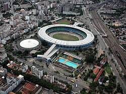 Futbol meydanının uzunluğu 90–110 metr, eni 60–75 metr olan düzbucaqlı şəkildədir. Qısa tərəflərin ortasında bir-biri ilə üzbəüz iki qapı olur, dəri topu da bu qapılardan keçirmək lazımdır. Futbol qapısının sahəsi 18 m-dir (eni 7.32 m, hündürlüyü 2.44 m). Dünyada ən böyük stadion Braziliyanın Rio-de-Janeyro şəhərindəki "Marakana" stadionudur. "Marakana" stadionu 200 min tamaşaçı tutumuna malikdir.