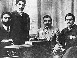 "Hümmət" partiyasının yaradıcılarıyla birgə. Soldan sağa: Məşədi Əzizbəyov, Əjdər Məlikov, Əsədulla Axundov və Məhəmməd Əmin Rəsulzadə