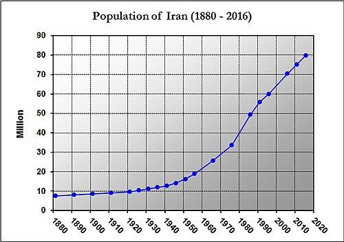 MKİ-ə əsasən İran İslam Republikası dünyada ən çoxsaylı əhaliyə malik XIX ölkədir. İran əhalisi sürətlə artan ölkələrdəndir. Rəsmi sayımlararası 55 ildə (1956–2011) ölkənin əhalisi 4 dəfə artmışdır. Ərazi üzrə orta sıxlığa görə İran Asiya ölkələrinin əksəriyyətindən geri qalır (1 km²-də 46 nəfər). Ölkə əhalisinin 4/5-ü şimal və şimal-qərb regionlarında cəmləşdiyi halda, ərazisinin təxminən 2/3-sini əhatə edən səhra və yarımsəhra regionlarında 1 km²-də sıxlıq 2-3 nəfərdən artıq deyil. Tehran, Məşhəd, İsfahan, Kərəc, Təbriz, Şiraz, Əhvaz və Qum şəhərlərinin əhalisi 1 milyondan artıqdır. 2011-ci il siyahıyaalınmasına əsasən qeyri-şəhər əhalisi içərisində 56.225 nəfər köçəri olaraq yaşayır.